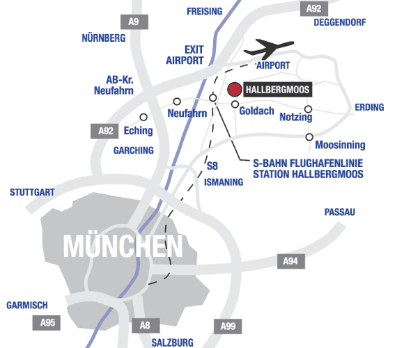 Fahren Sie bis zum "Autobahnkreuz "Feldmoching" und dann immer weiter Richtung Flughafen München. Verlassen Sie die Autobahn direkt an der Flughafen-Ausfahrt. Folgen Sie der Beschreibung wie oben.